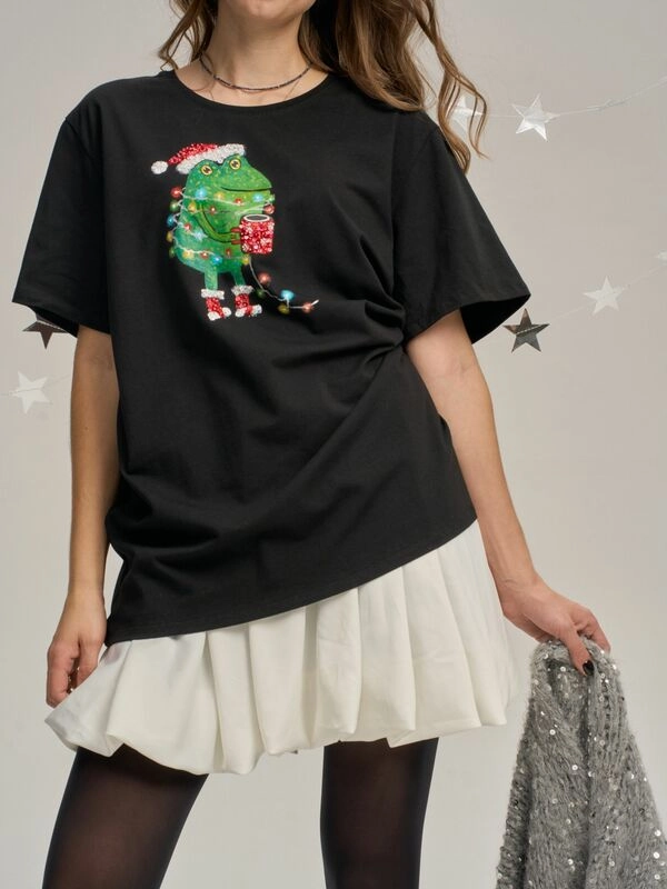 Футболка Новогодний жабёнок женская прямого кроя с росписью и вышивкой ручной работы. Авторский эскиз. Роспись ручной работы.