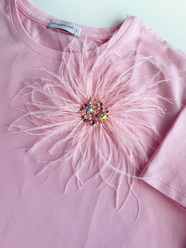 Розовая футболка с перьямис вышивкой