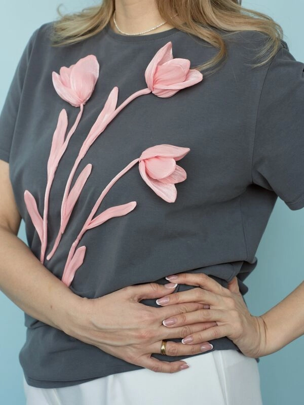 Кутюрная футболка с тюльпанами ручной работы из итальянского шифона.