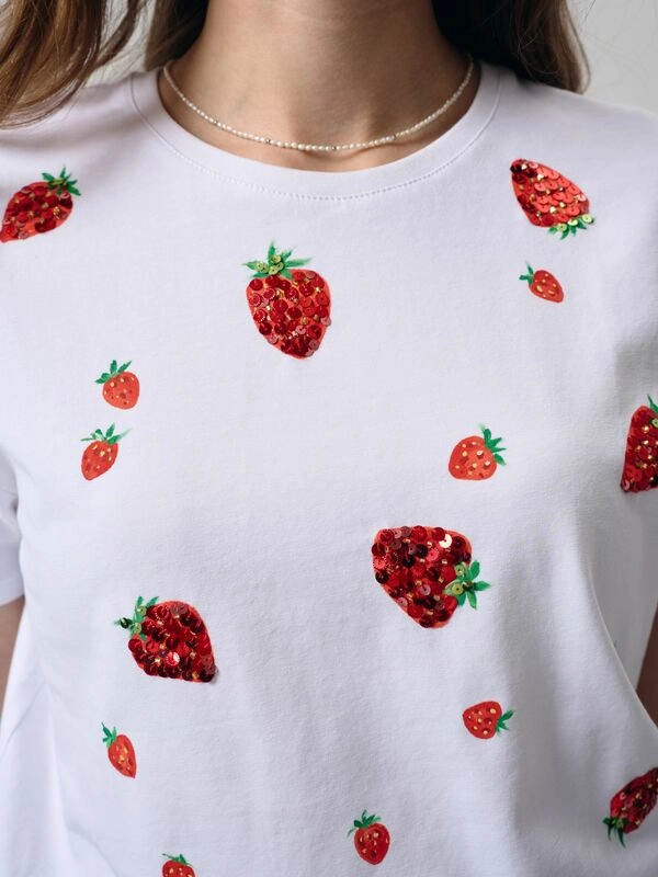 Футболка клубникис принтом и вышивкой